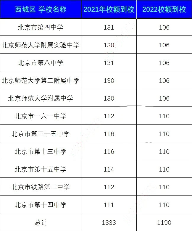 1. 因为校额到校的绝大部分名额是给到区内初中校的,但也有少部分给到了区外学校,例如北师大附属实验中学虽然校额到校总额有132个,但给到西城区内仅有106个,其余还有26个名额都是给外区的。本文只讨论区内情况,不考虑区外情况,同样的,统招名额也只计算区内情况,不包含跨区情况,毕竟给到区外的名额本身跟西城区的学生也没关系