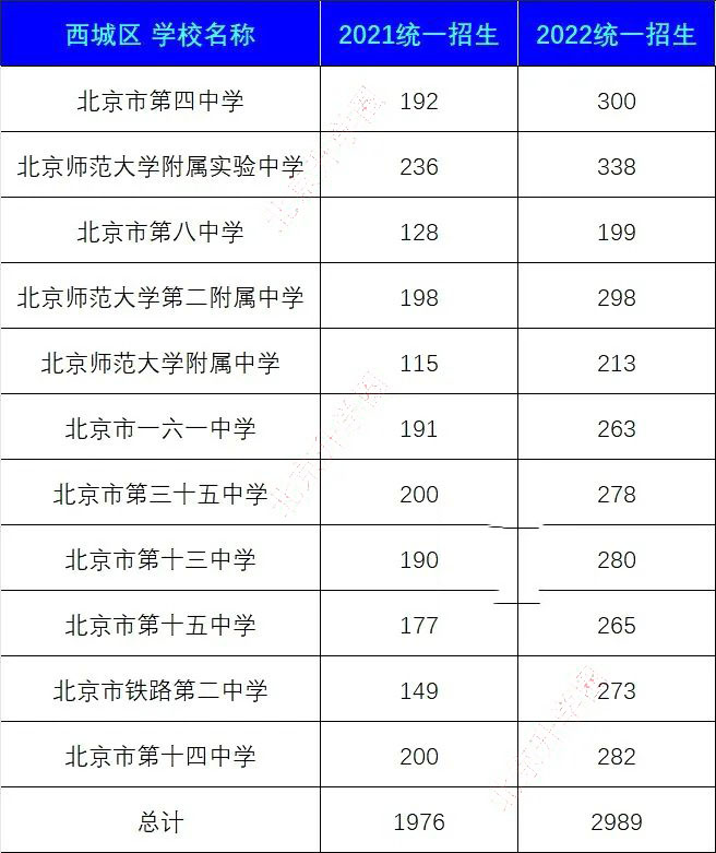 另一方面,尽管校额到校的数量减少了,但统招的名额增加了,西城11所优质高中2021年统招总数为1976个,2022年统招总数为2989个,总计增加了1013个名额