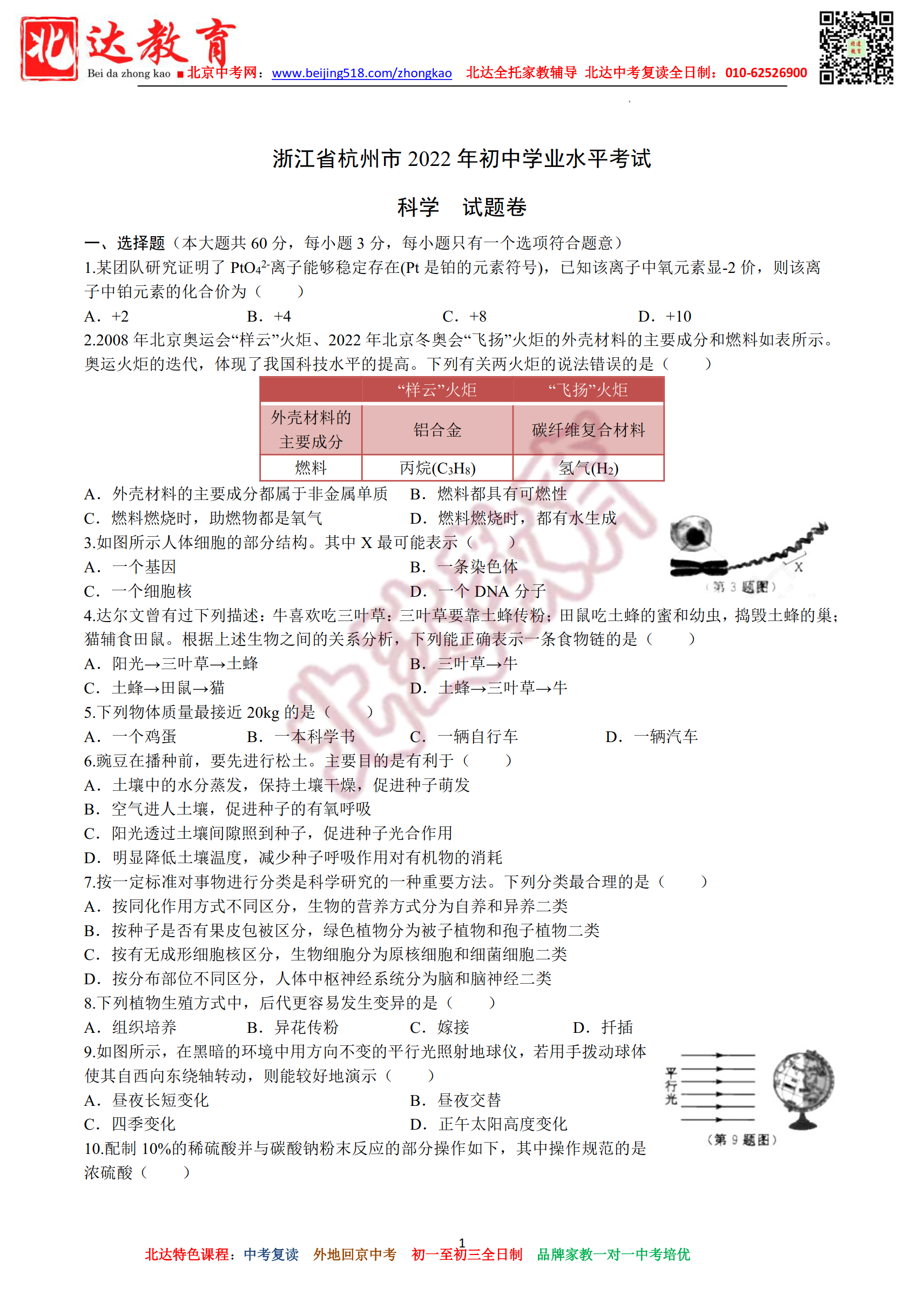 2022年浙江省杭州市中考科学试题及答案