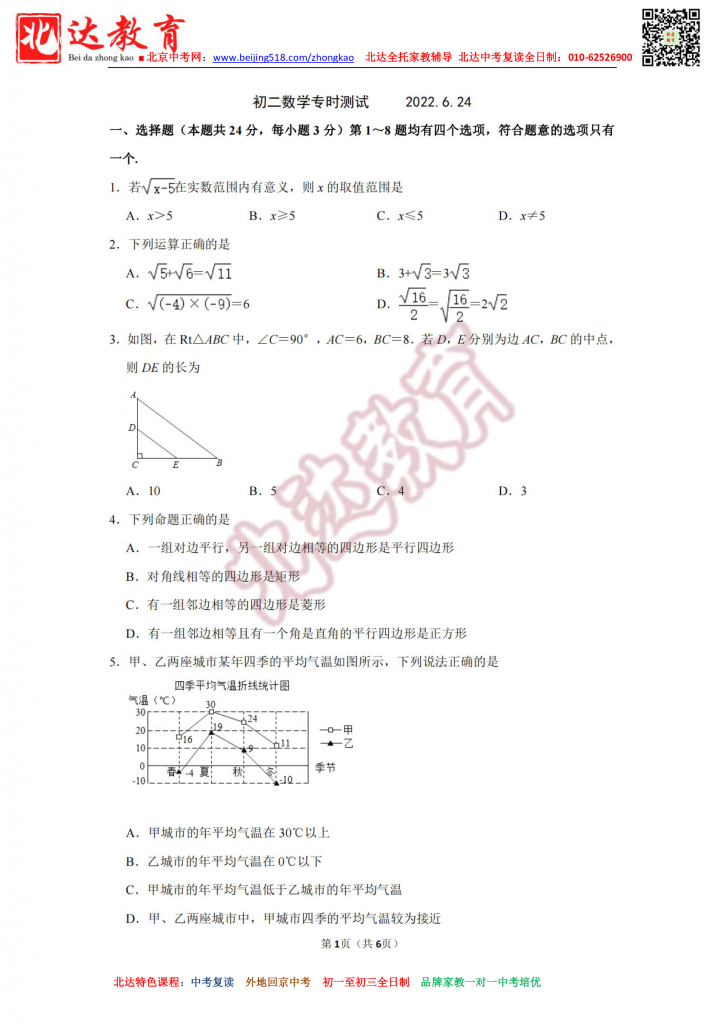 北京陈经纶中学2022初二下数学期末模拟试卷(高清版)。admw360中考复读学校教研组收集整理,分享给大家。