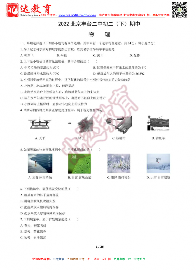 北京丰台二中2022初二下期中物理试题及答案(高清版)。admw360中考复读学校教研组收集整理,分享给大家。
