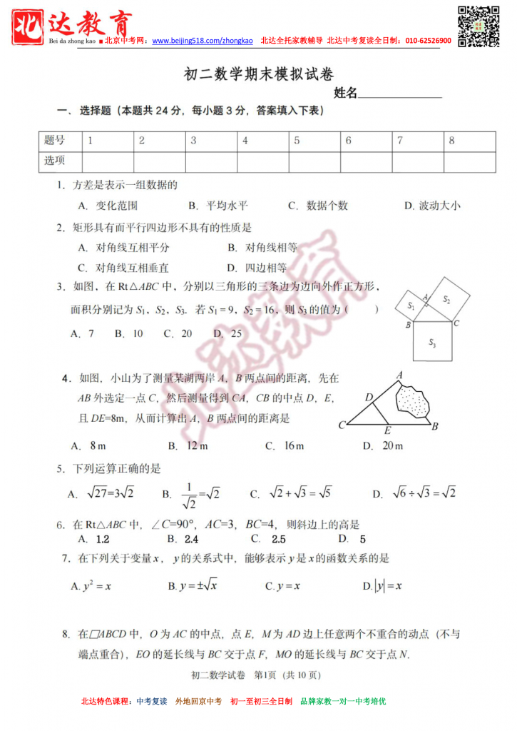 北京工大附中2022初二下数学期末模拟试卷(高清版)。admw360中考复读学校教研组收集整理,分享给大家。