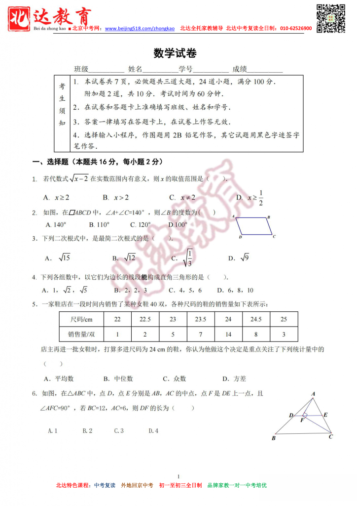北京十三中分校2022初二下数学期末模拟试卷(高清版)。admw360中考复读学校教研组收集整理,分享给大家。