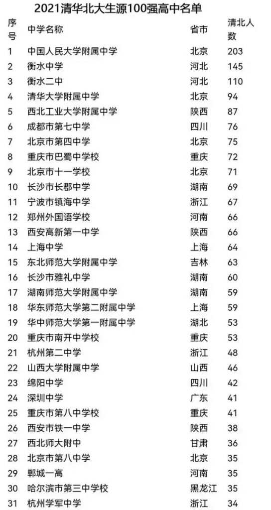 人大附居榜首,清北生源全国高中百强榜单出炉!