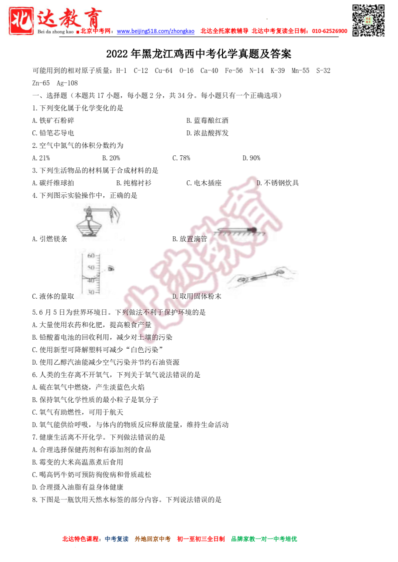 2022年黑龙江鸡西中考化学真题及答案
