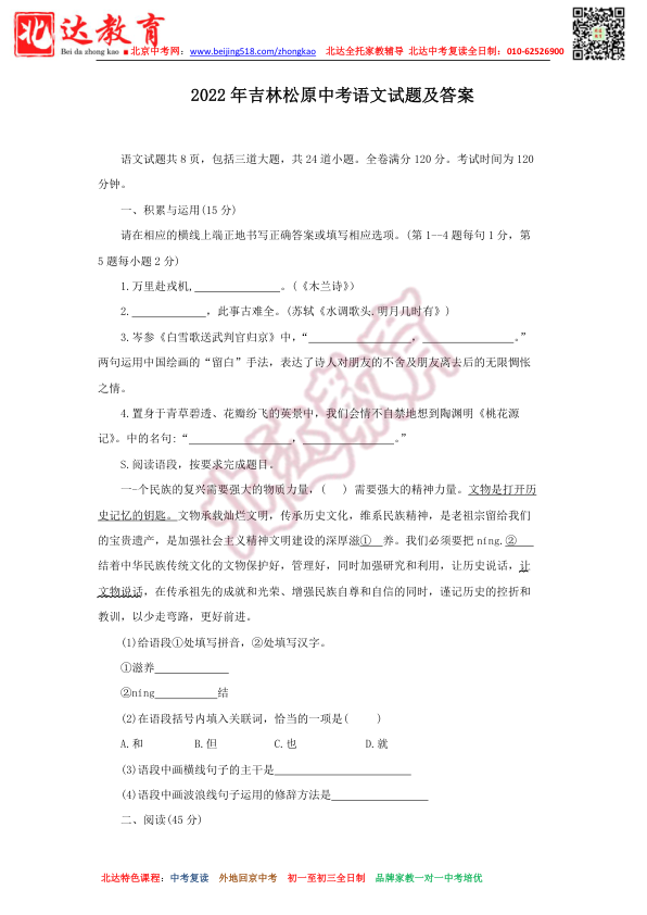 2022年吉林省松原市中考试题及答案汇总。admw360教研组收集整理,分享给大家。