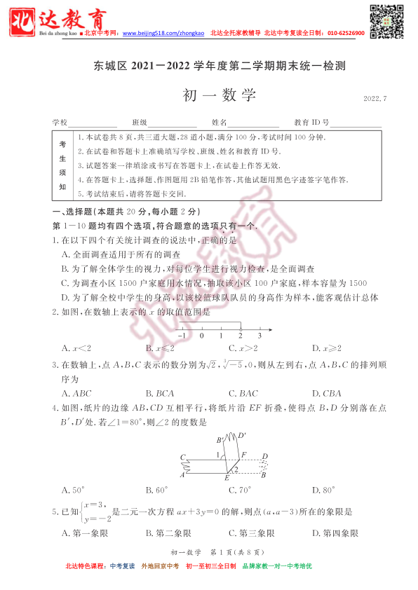 2022年北京各区初一(下)期末试题及答案汇总