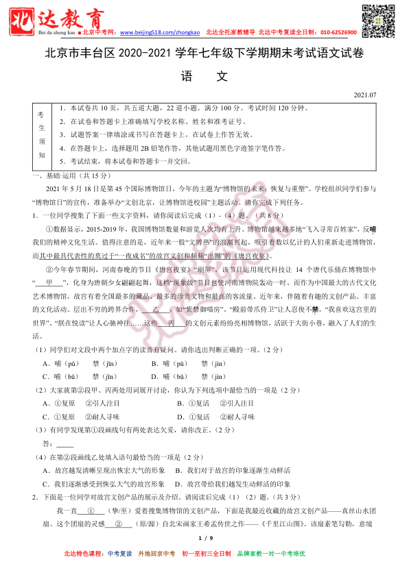 北京丰台区2020-2021学年初一(下)期末考试语文试卷(含答案)