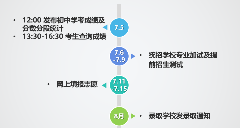 ● 参加统一招生录取的考生需在7月11日-15日上网填报统一招生志愿。统一招生录取中还包括“特长生”等对特殊学生的录取。今年普高中外合作项目招生也纳入统一招生录取。