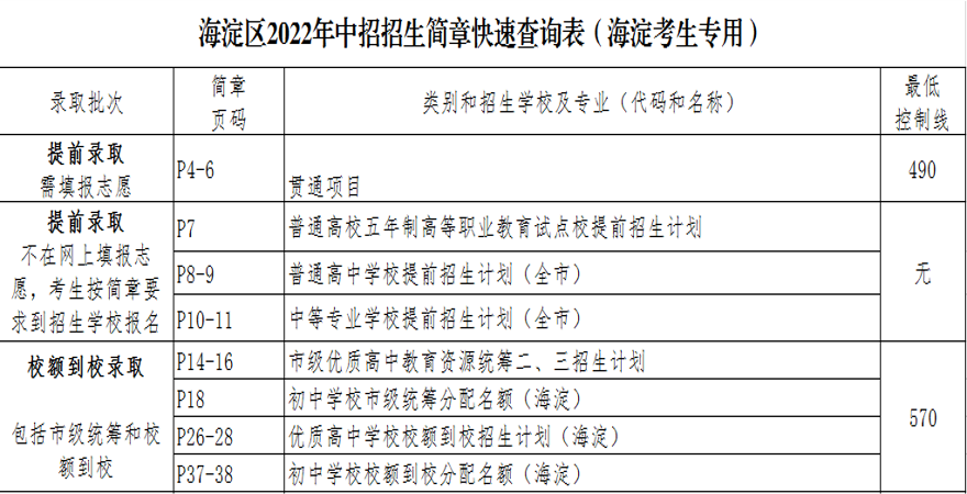 在中招的三个录取批次中,每种录取途径都对考生资格有相关的要求,中招办制作了《海淀区2022年中考录取各批次相关要求一览表》,考生填报志愿时可参看。
