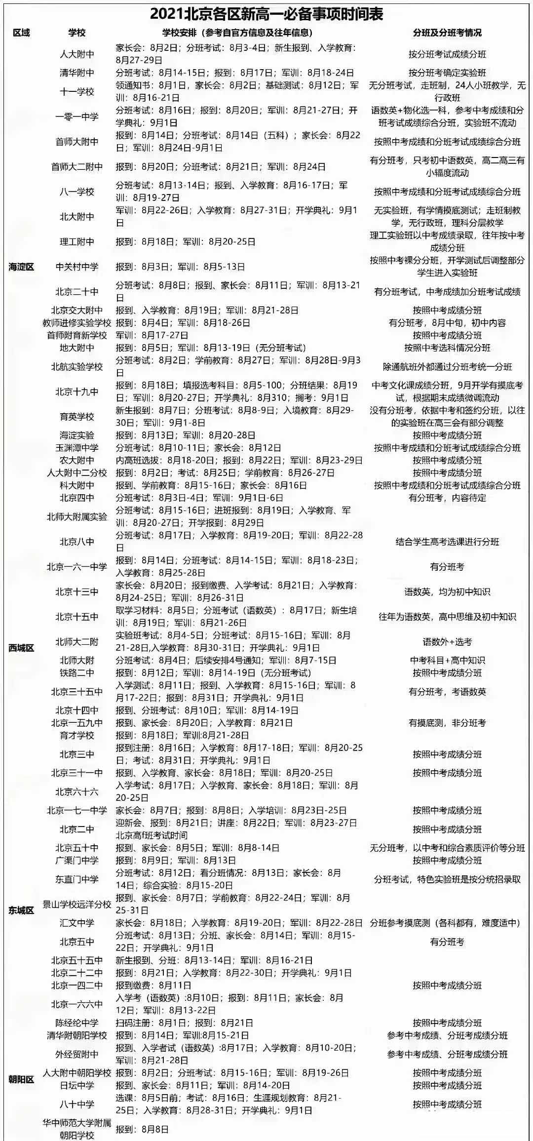 | 区县 | 学校 | 报道时间 | 分班考时间 | 军训时间 | 分班考科目 |