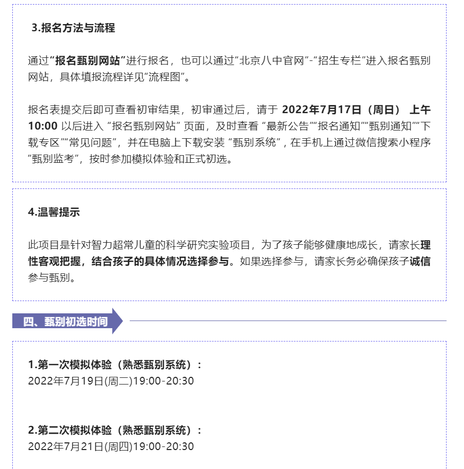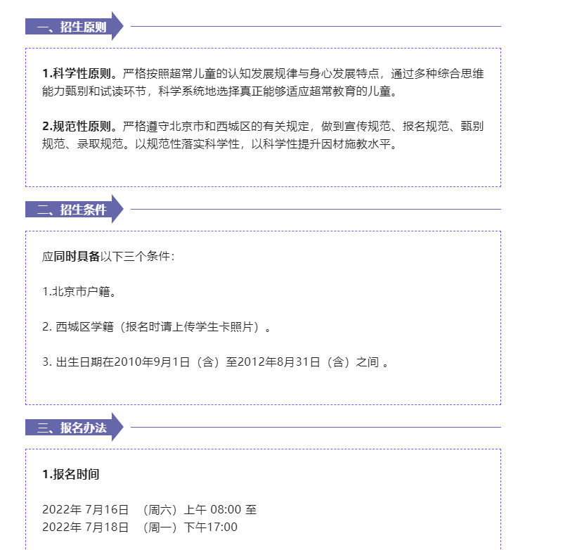 昨天(7月15日),北京八中发布2022超常教育实验项目招生简章,相比去年,今年八中超常教育实验项目招生只面向西城区学籍。出生日期要求在2010年9月1日(含)至2012年8月31日(含)之间 。这一招生条件的变化,引发家长广泛关注。之前八中少素的要求都是:北京市户籍+北京市学籍。今年要求必须是北京市户籍和西城区学籍,并且要求上传学生卡照片,意味只有西城的小学生才有资格参加,不符合条件的孩子可能都无法参加考试。去年的招生年龄要求是四升五的孩子可以参加,而今年的要求是2010年9月1日至2012年8月31日,这也意味着在西城上小学的孩子,四升五和五升六的孩子都可以参加。