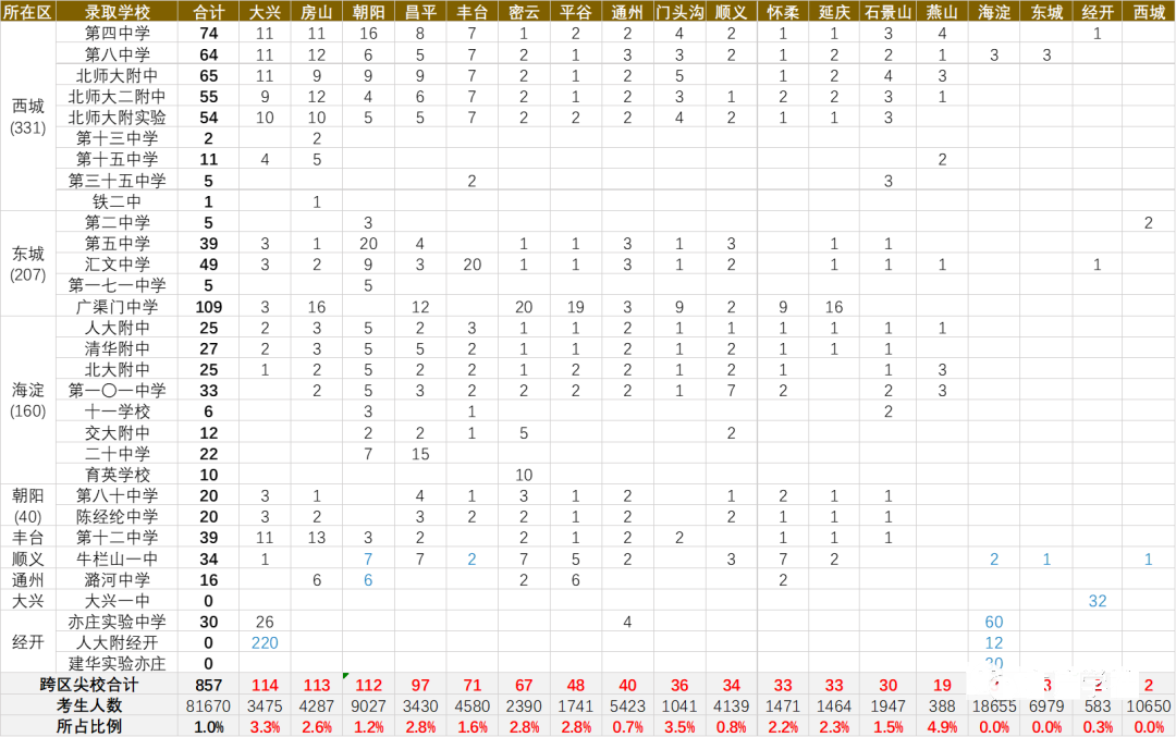 9、这个统计图里面最后有占比,这个占比是从被掐区的角度,统计了一下各个区被掐走的占比。如果能从掐入区的角度,统计一下掐过去的这些人占掐入区的占比就更好了,尤其是统计一下单个学校的占比,这样就知道哪些学校其实是靠全市掐尖在活着。可以不严谨的用今年的数据大概算一下:比如东城掐了201,今年考生人数6979,大概掐过去的人数2%左右,西城大概3%左右。
