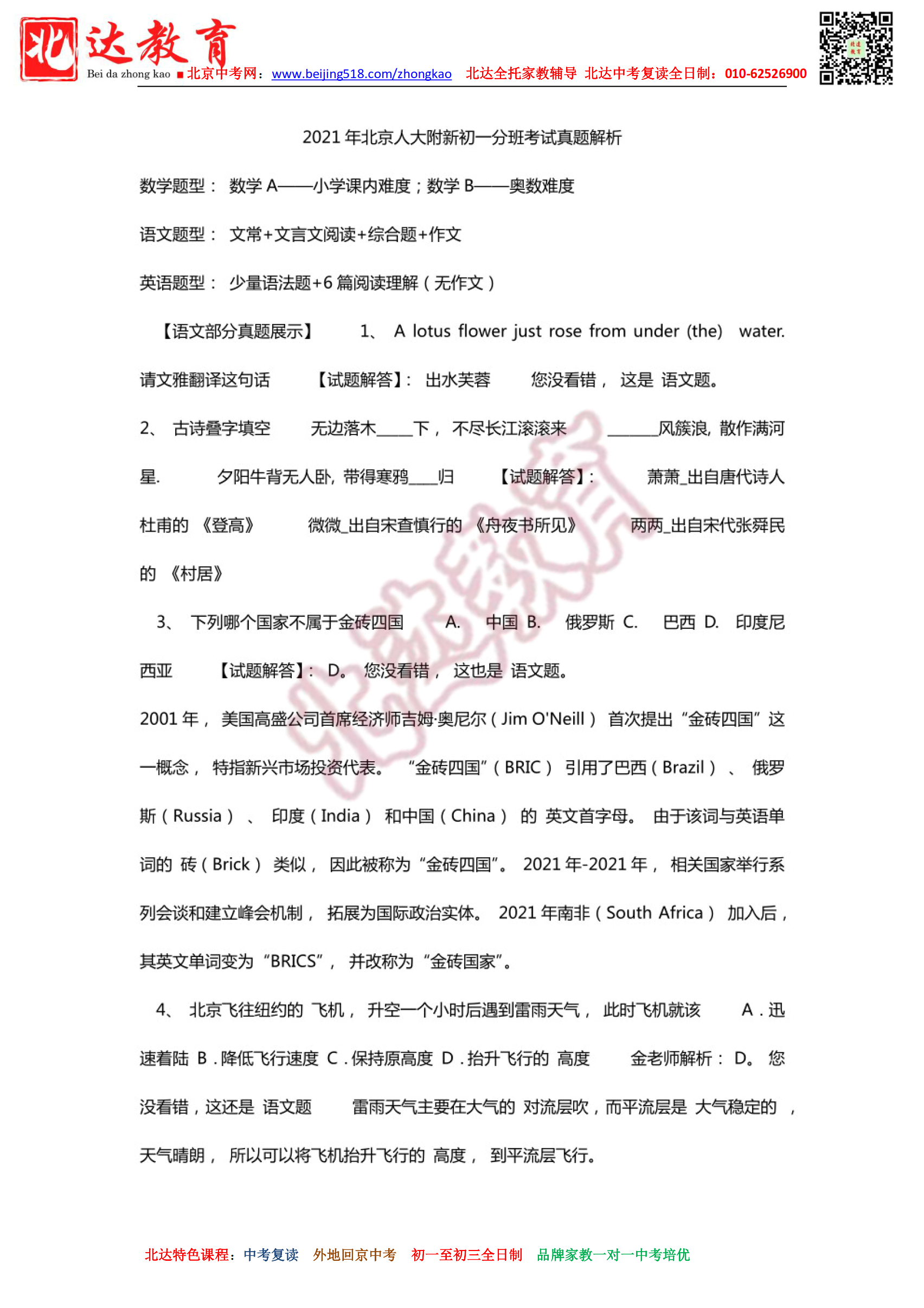 北京人大附中历年新初一分班考试真题含解析。admw360教研组收集整理,分享给大家。