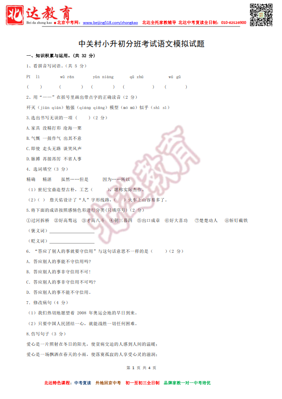 北京市中关村中学历年年新初一分班考试真题。admw360教研组收集整理,分享给大家。
