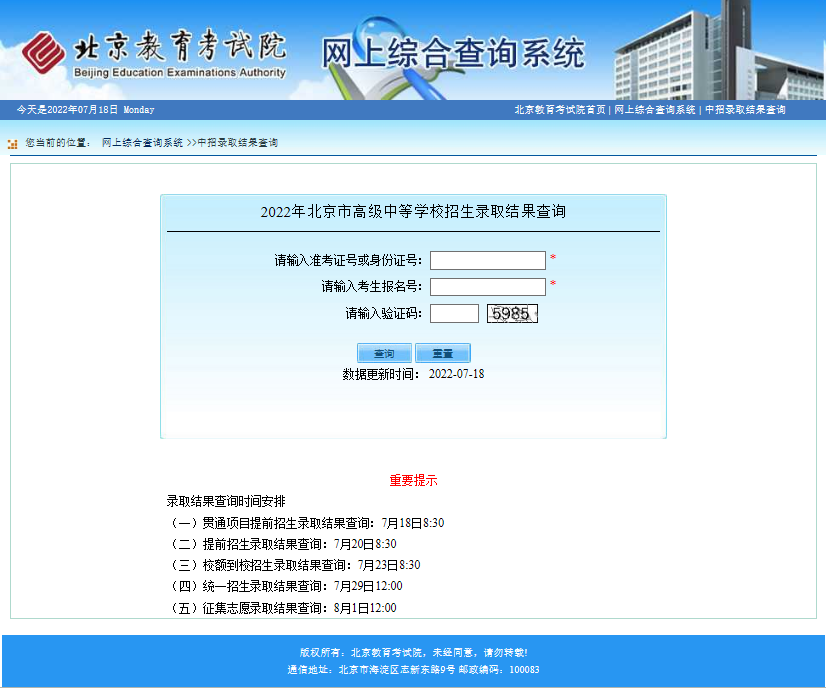 随后,在2022年北京市中招录取页面里,会自动弹出2022年北京市高级中等学校招生录取结果查询框。