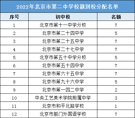 北京二中在面向东城区的校额到校招生计划中,2022年共在12所初中校有校额到校招生名额,共计招生63人。