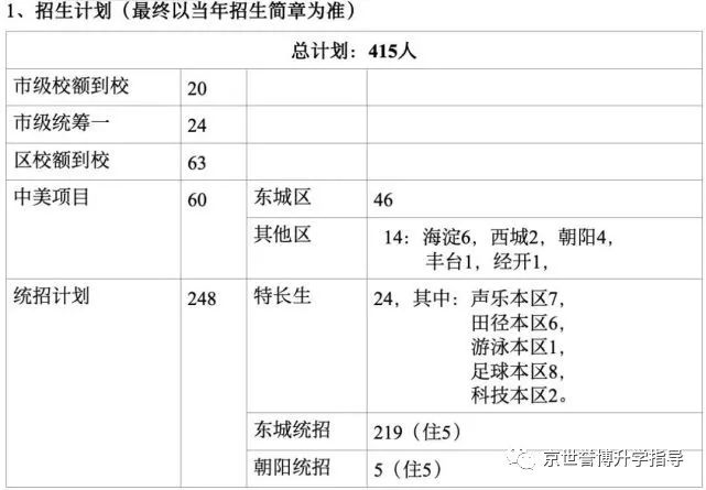 2.三增加:招生计划人数为305人,比去年增加35人;校额到校人数为62人,比去年增加10人;在东城统招人数为243人,比去年增加25人。