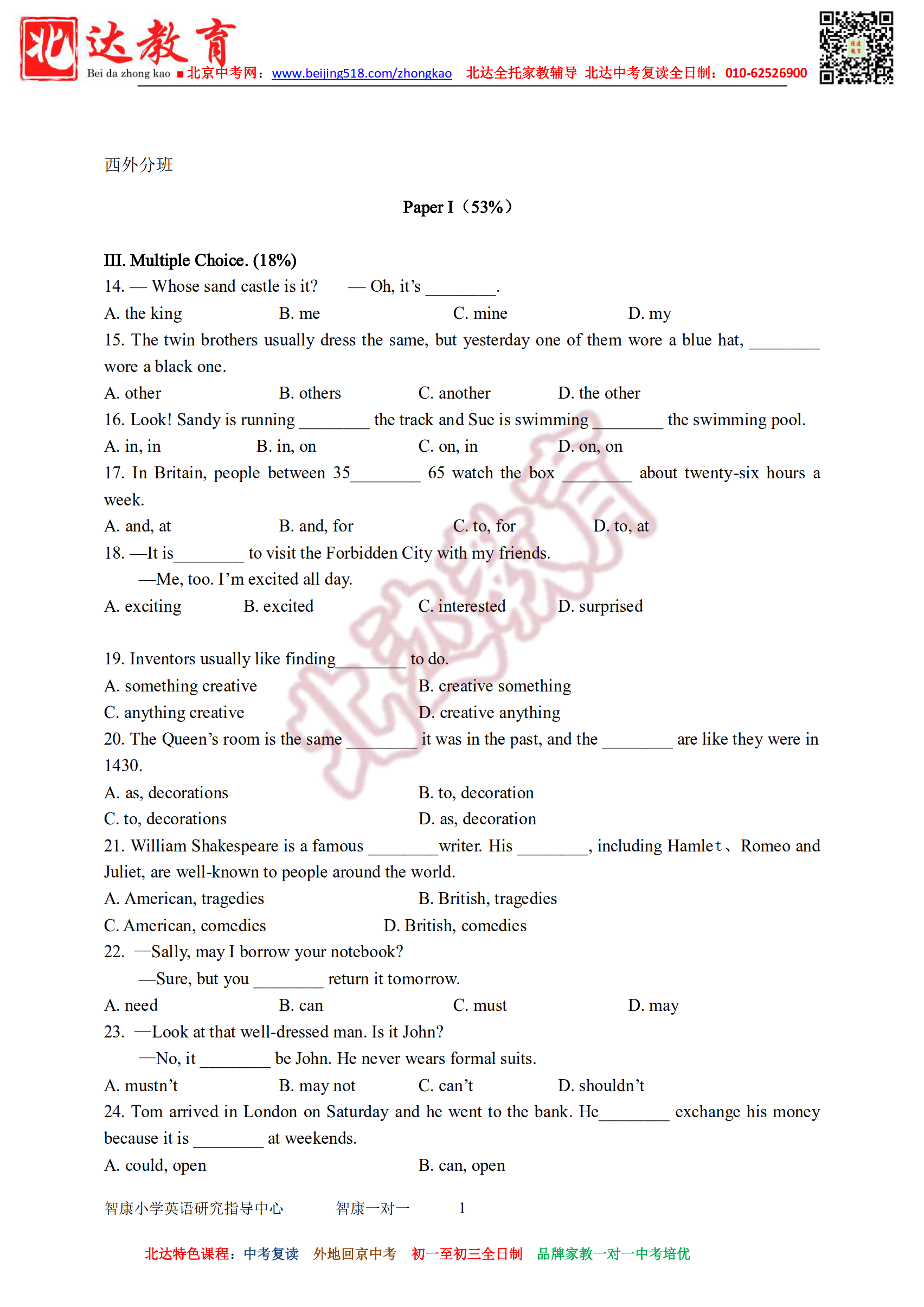 2017年西城外国语新初一分班英语真题试卷&答案