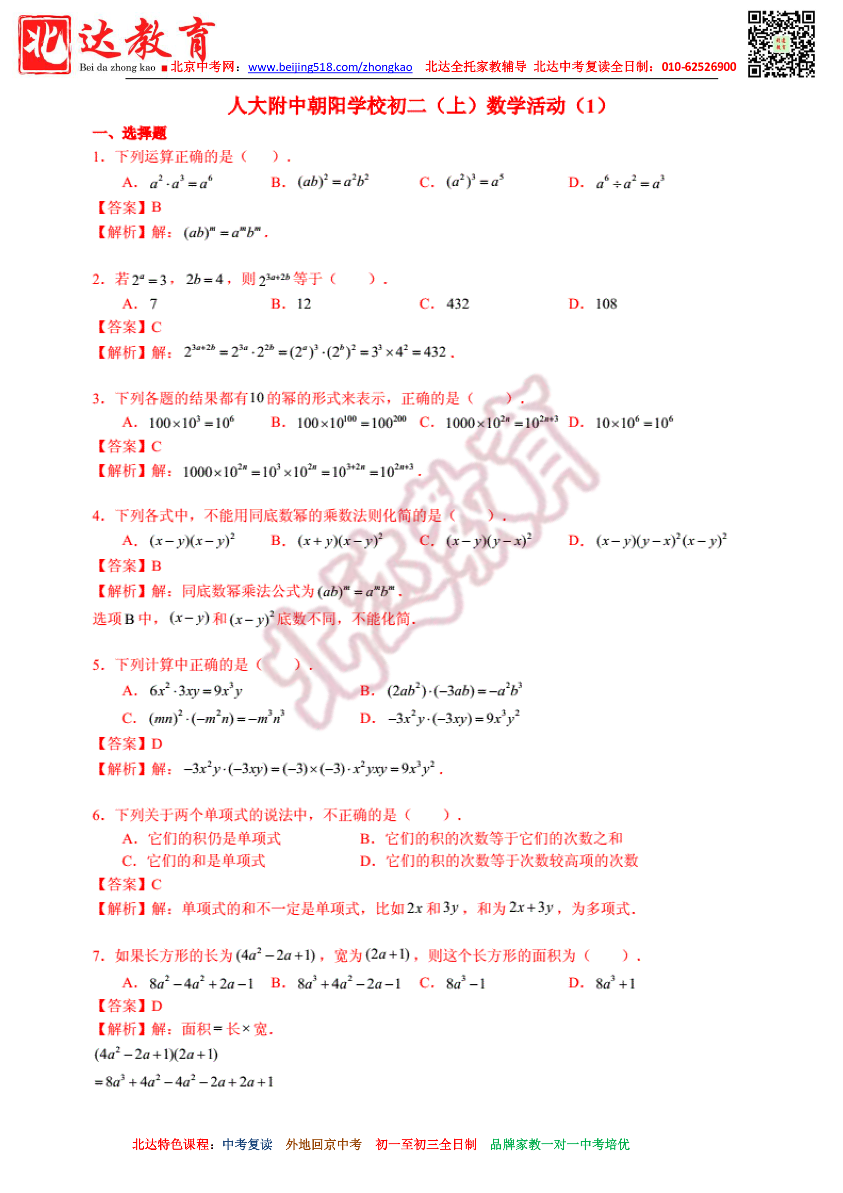 北京人大附中初二周测数学试题及答案汇总!北京admw360教研组整理分享相关信息,供大家参考。
