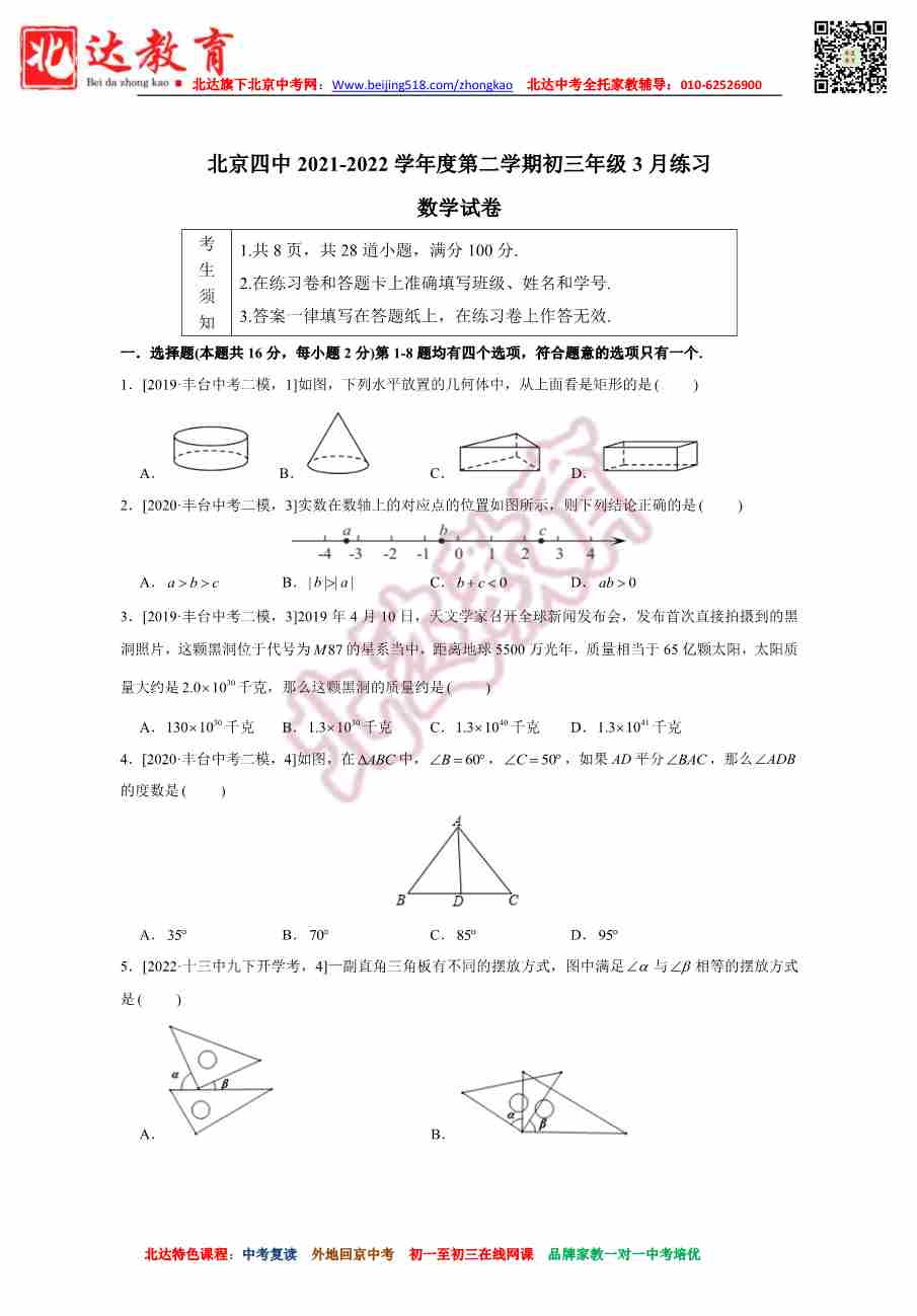 北京四中2022年3月初三下数学月考练习试卷.pdf