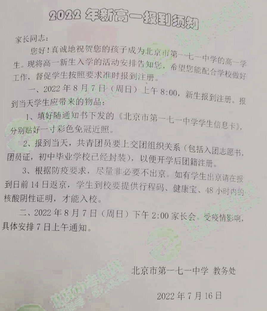 2022年北京一七一中学新高一入学通知!北京admw360教研组整理分享相关信息,供大家参考。
