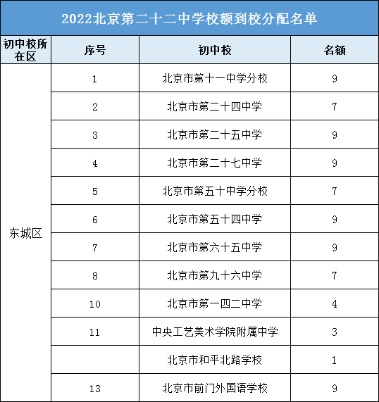 北京二十二中分配给东城区13多初中校共计83个校额到校名额