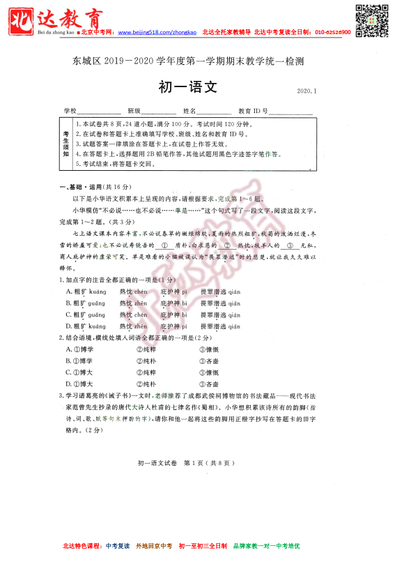 2019-2020学年东城区初一(上)期末语文试卷(无答案).pdf