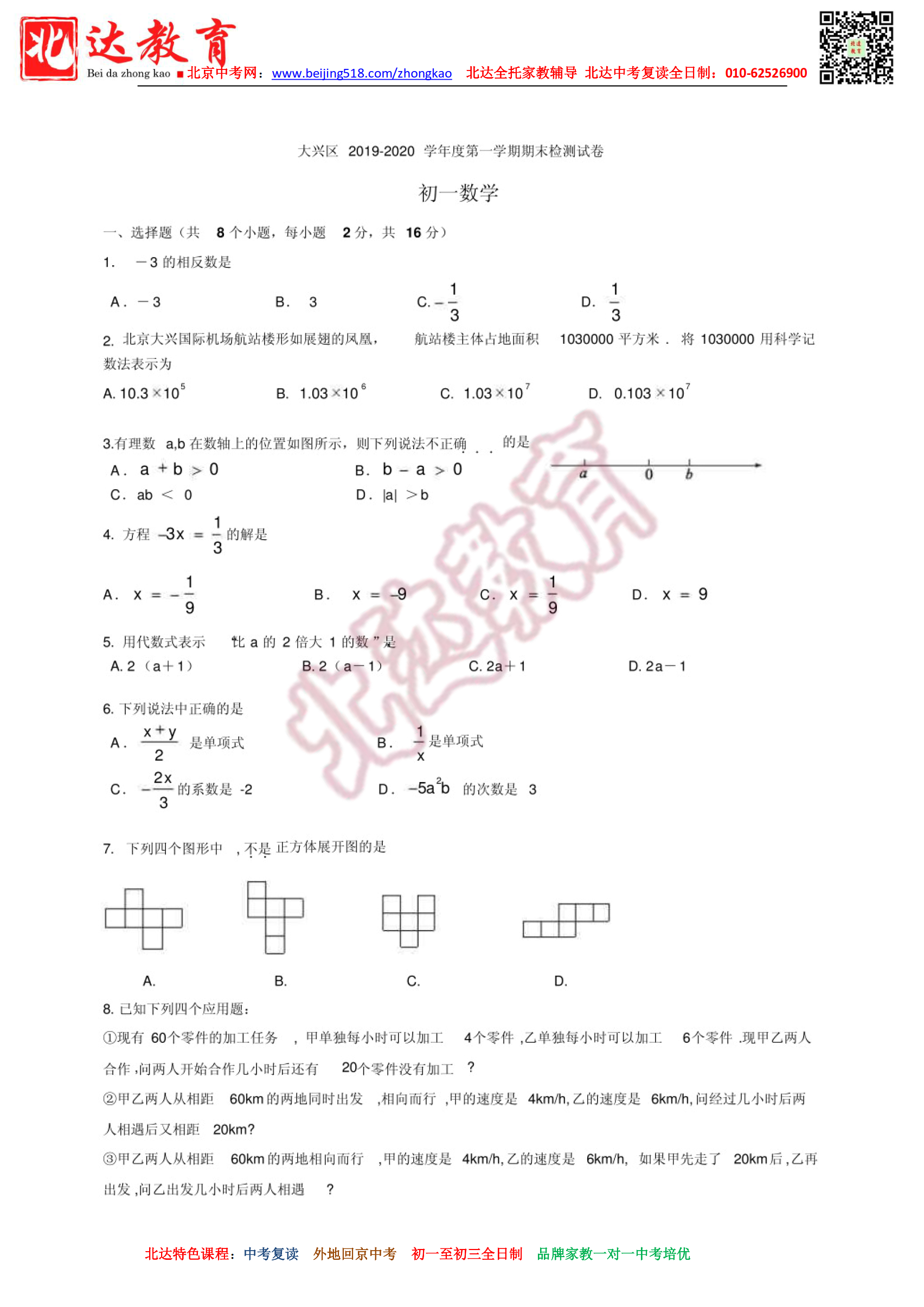 2019-2020学年北京市大兴区初一(上)期末数学试题及答案.pdf