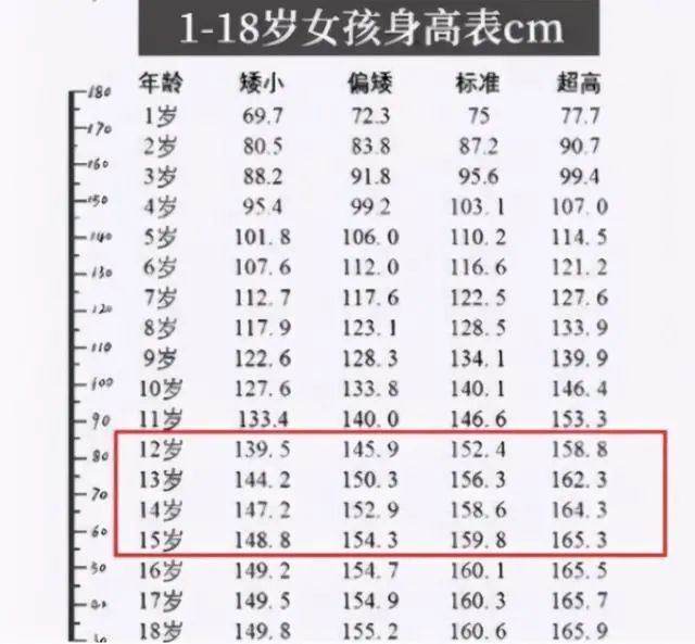对照这样的一张1~18岁女孩的身高表,可以看到处于青春期也就是12~15岁的孩子,身高的标准都已经列出,如果说自己的孩子偏矮或者是被判定为矮小的话,那么这个时候家长就应该多加注意了,一般来说初中毕业也就是15岁左右,女孩的身高若是在1米5以下就是偏矮了