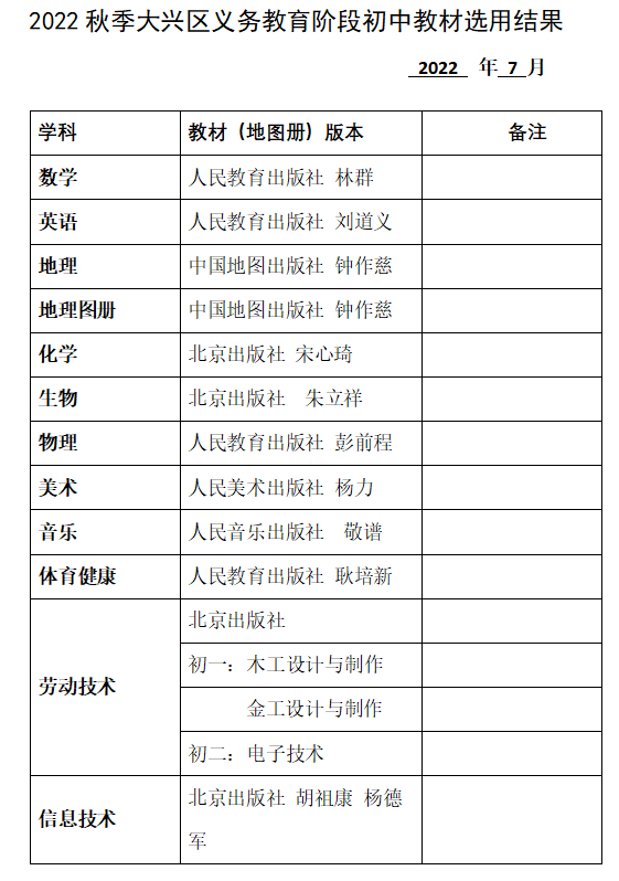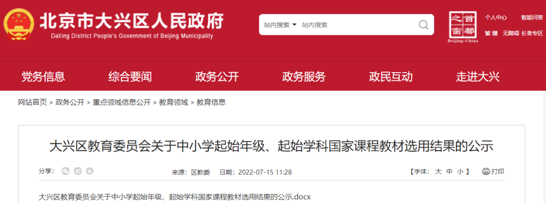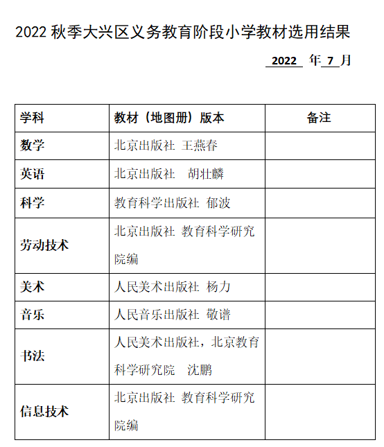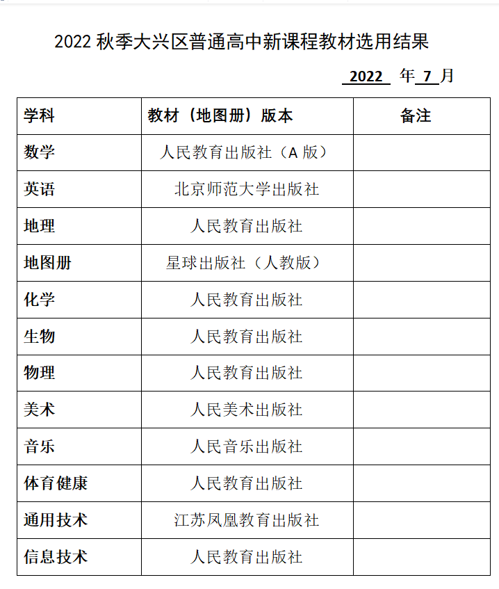 日前,大兴区公布小学、初中、高中2022年教材用书情况: