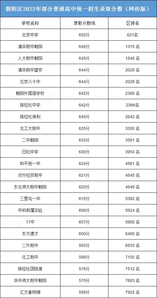 1、以上2022年朝阳区录取分数线为网传版,非官方公布!