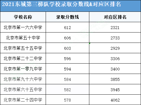 根据2021年东城区分数段比率和东城区录取分数线,我们将东城区的高中校分为三个梯队: