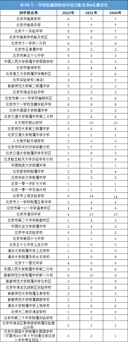 从近3年十一学校 校额到校名额来看,十一学校对初中校的校额到校名额分配有增有减,需要注意的是2022年十一学校将校额到校名额有新分配了5所初中校,分别是人大附航天城学校、北京十一晋元中学、北京五十七中上庄分校、清华附上庄分校、北师大二附中海淀学校。 所以后期考生想要通过校额到校报考十一学校还要看当年有没有分配名额给自己所在初中校,更要关注自己的校排名。