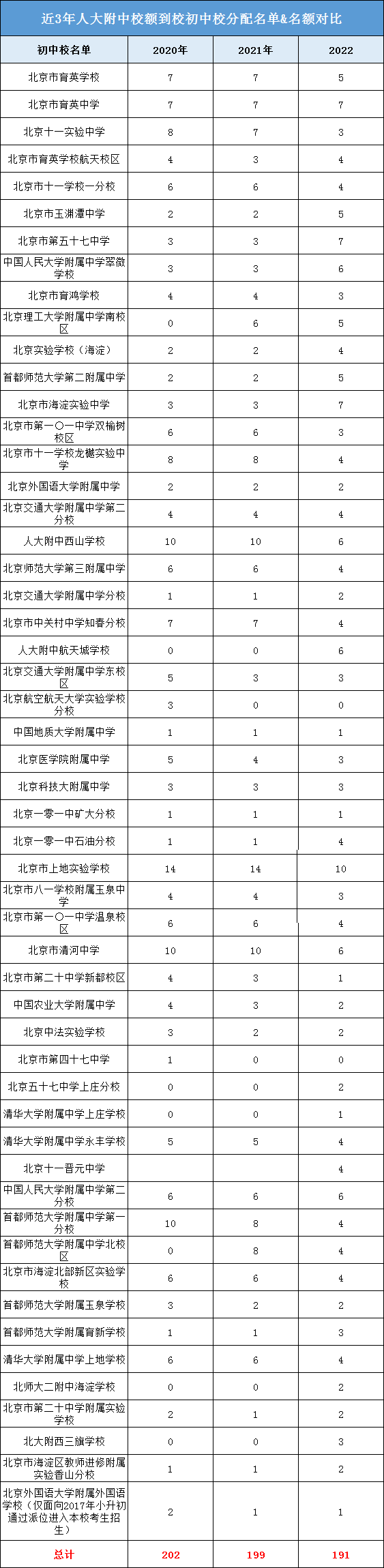 从近3年人大附校额到校名额来看,人大附对初中校的校额到校名额分配有增有减,需要注意的是2022年人大附将校额到校名额有新分配了5所初中校,分别是人大附航天城学校、北京十一晋元中学、北京五十七中上庄分校、清华附上庄分校、北大附西三旗学校。