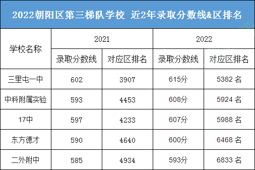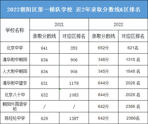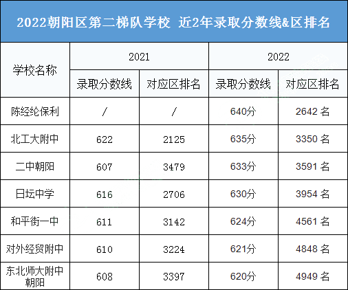 1、2022年朝阳区录取分数线在642分的学校有以上7所学校。北京中学从去年招生连续2年录取分数线位居榜首,超越老牌优质高中北京八十中和陈经纶中学。