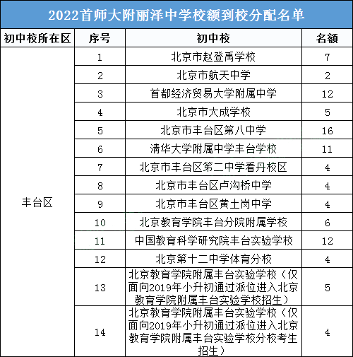 2022年首师大附丽泽中学有96个校额到校名额,分给了丰台区14所学校。