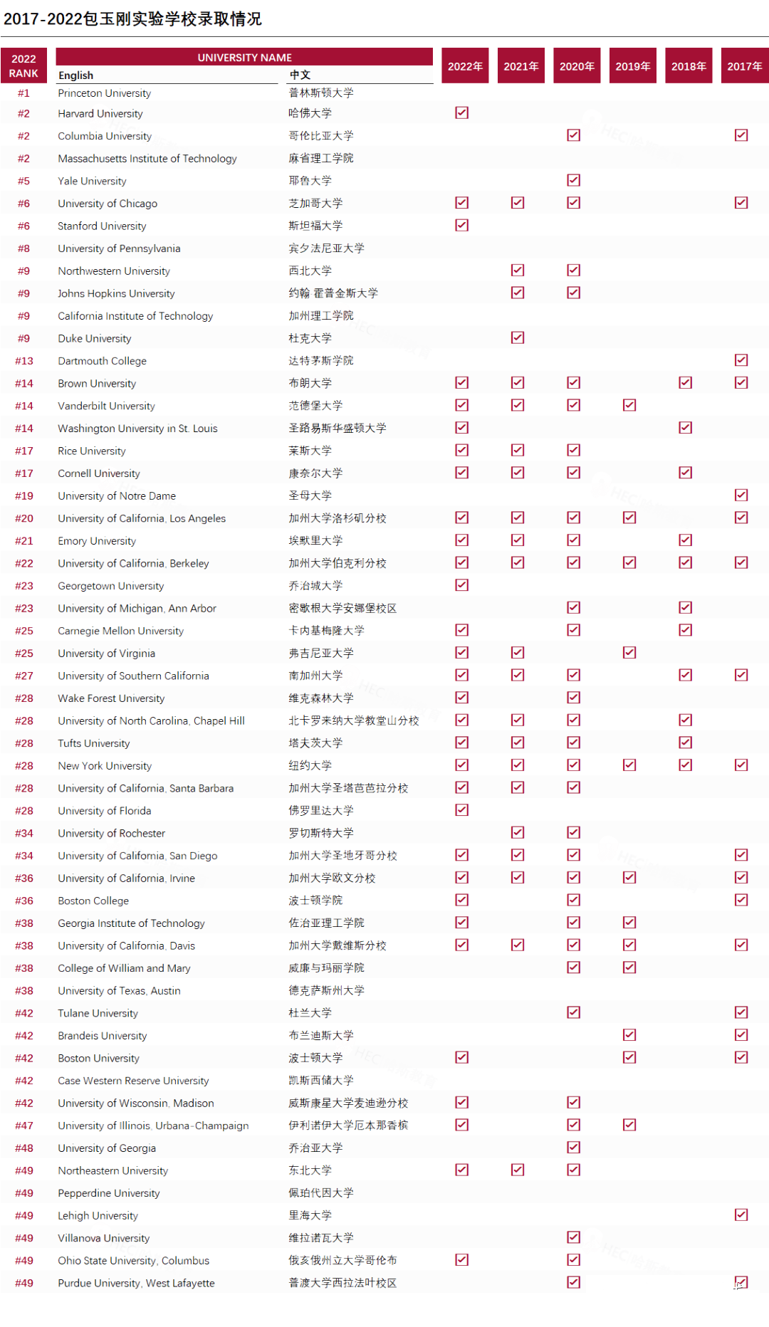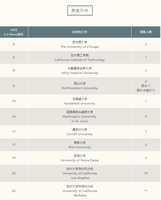 据不完全统计,包校2022届美本综合型大学前10录取有哈佛大学、斯坦福大学和芝加哥大学。前10和藤校中,对包校学生相对友好的是芝加哥大学和布朗大学。过去两年有相对稳定录取的西北大学和约翰霍普金斯大学,今年没有录取。另外,包校在前30到前15美本综合型大学的历年录取相对稳定,可以看出包校学生的整体的平均素养很高。