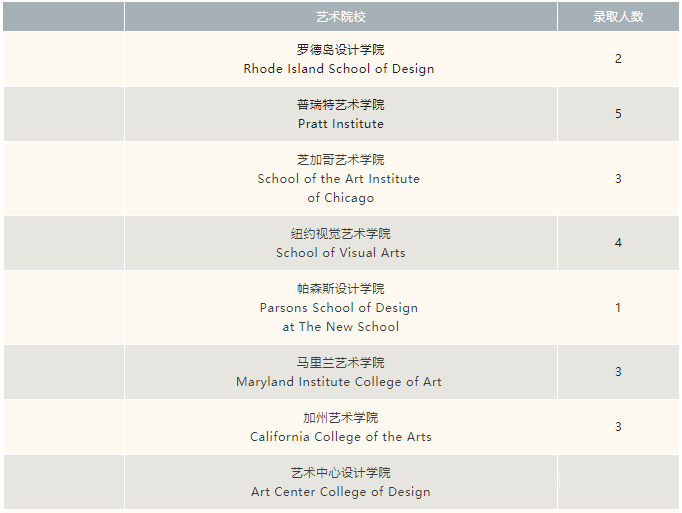 艺术院校方面,鼎石学生今年也再次收获骄人的成绩,陆续收到罗德岛设计学院、芝加哥艺术学院、普瑞特艺术学院、萨凡纳艺术设计学院、加州艺术学院、纽约视觉艺术学院、帕森斯设计学院等知名院校的录取通知书。