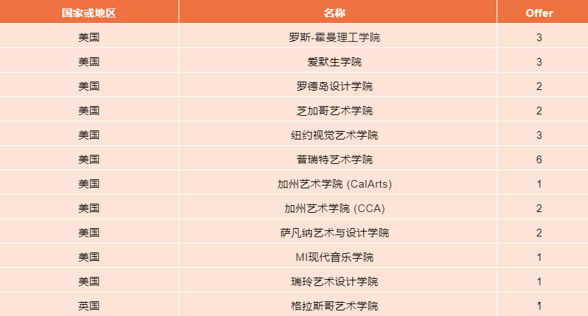 艺术方向,专业TOP5学校,伦敦艺术学院10份,纽约大学( 帝势艺术学院) 1份,罗德岛设计学院1份,帕森斯设计学院2份,纽约时装学院1份。