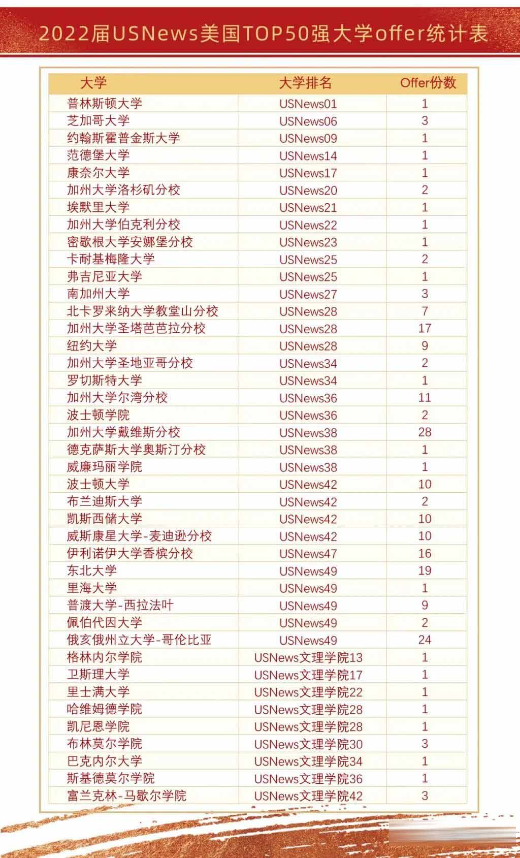 美国方向,藤校及USNewsTOP10学校,普林斯顿大学1份,芝加哥大学3份,康奈尔大学1份,约翰斯霍普金斯大学1份。