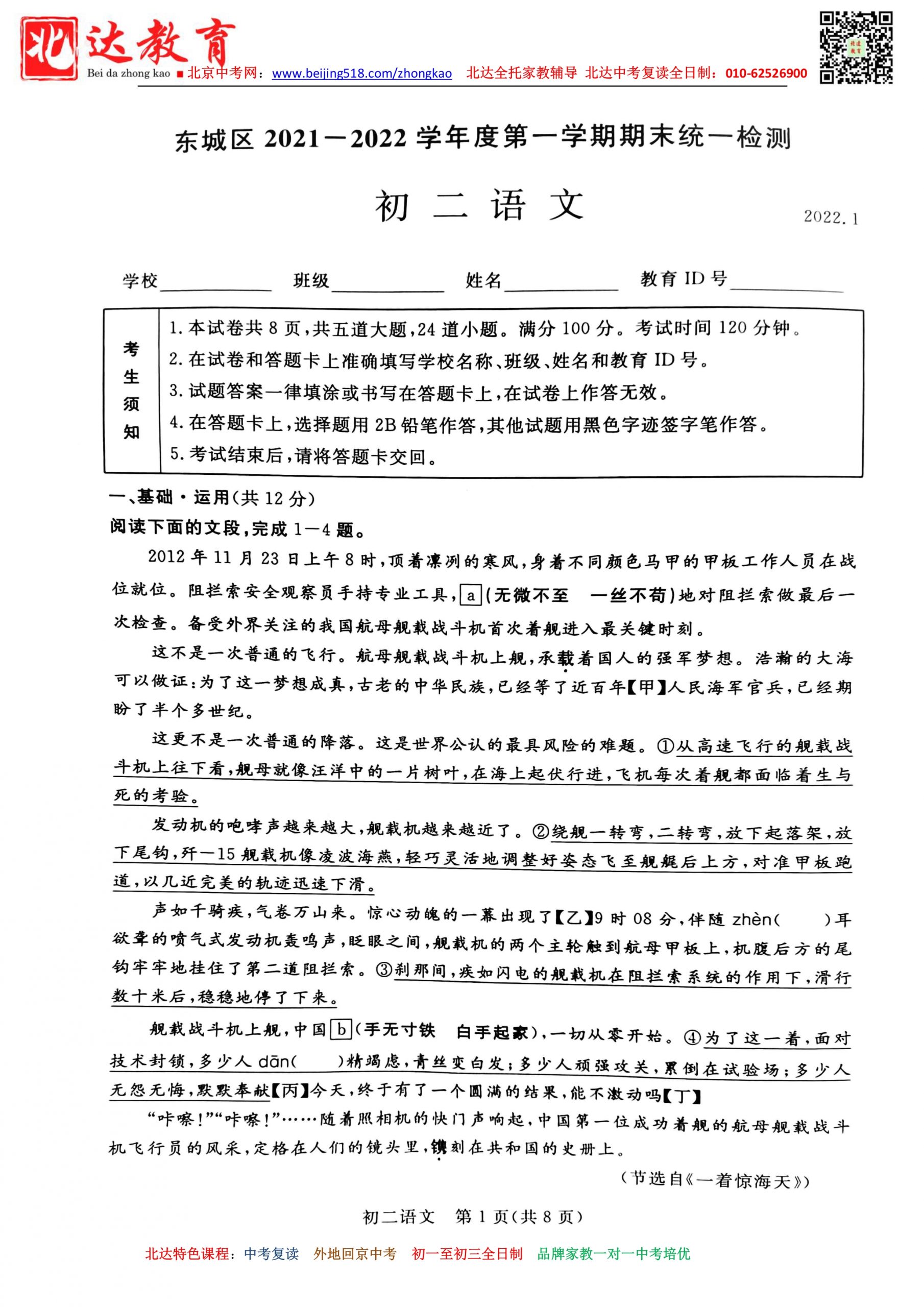 2022北京市东城区初二(上)期末语文试卷及答案.pdf