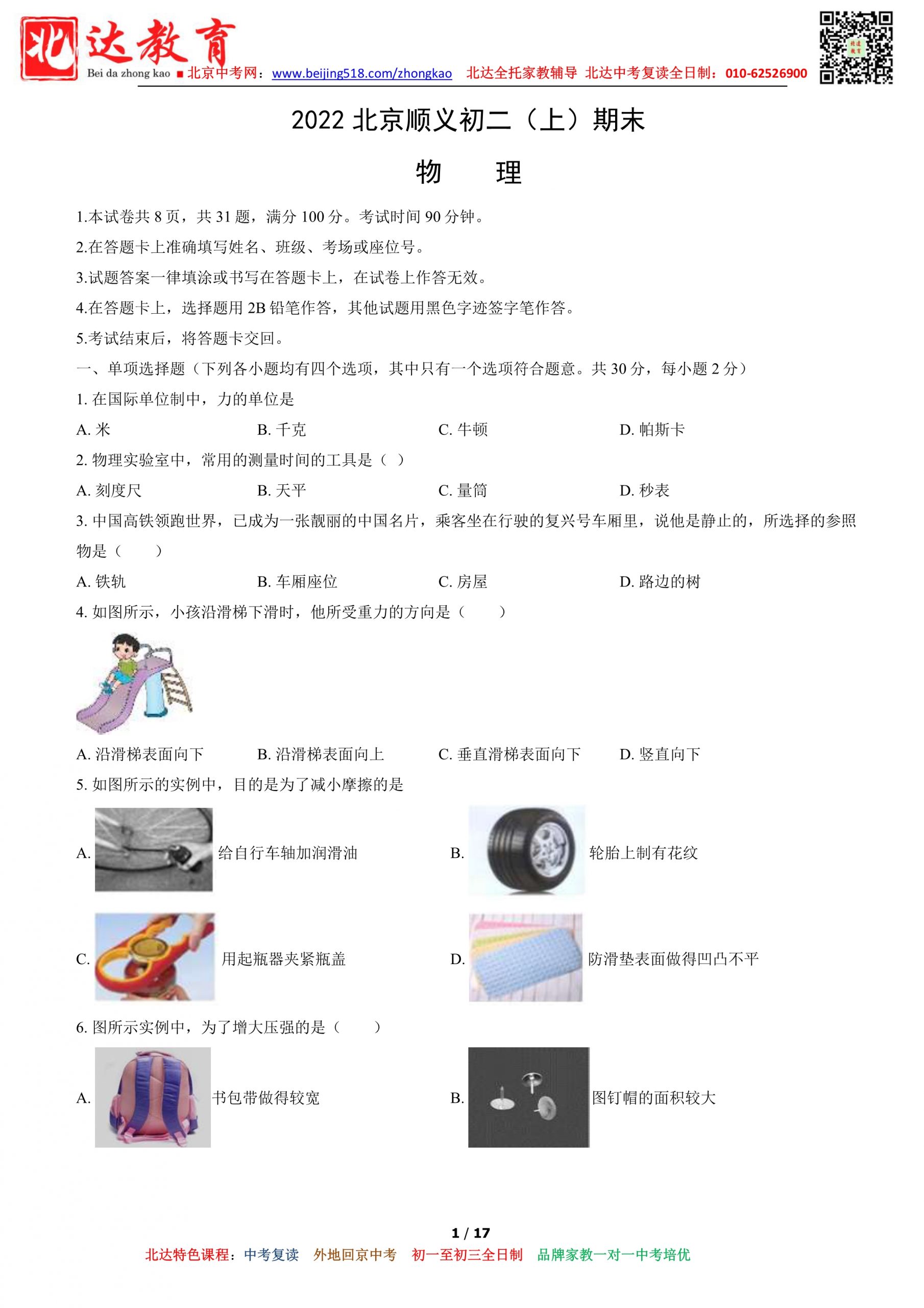 2022北京市顺义区初二(上)期末物理试卷及答案!北京admw360教研组整理分享相关信息,供大家参考。