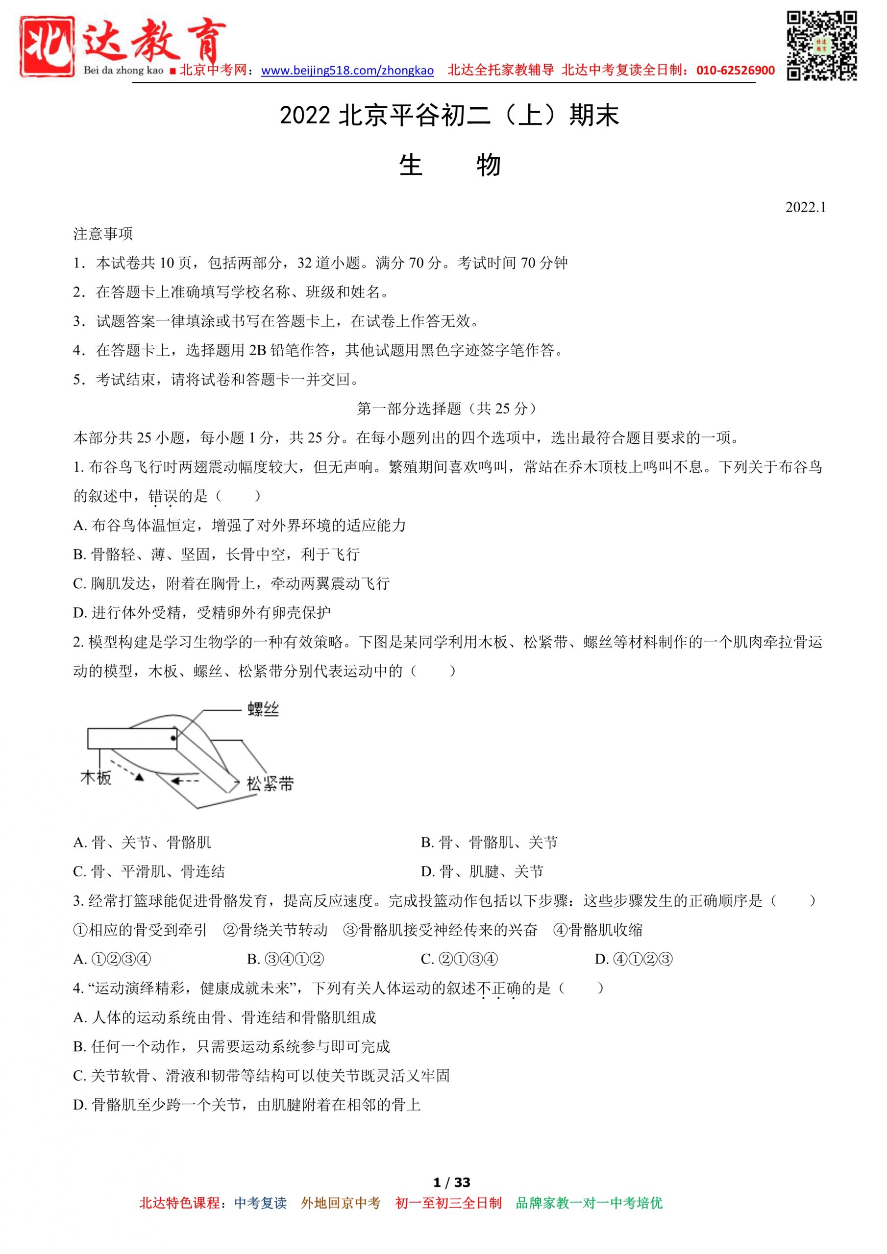 2022北京市平谷区初二(上)期末生物试卷及答案.pdf