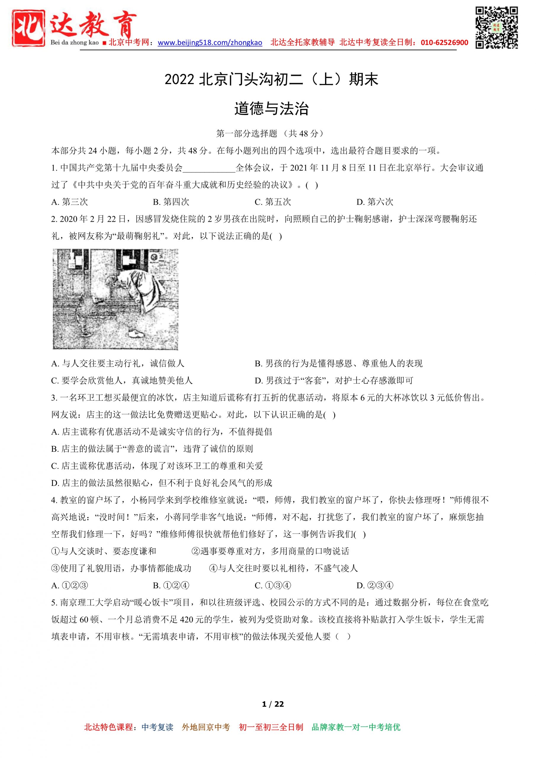 2022北京市门头沟区初二(上)期末道法试卷及答案.pdf