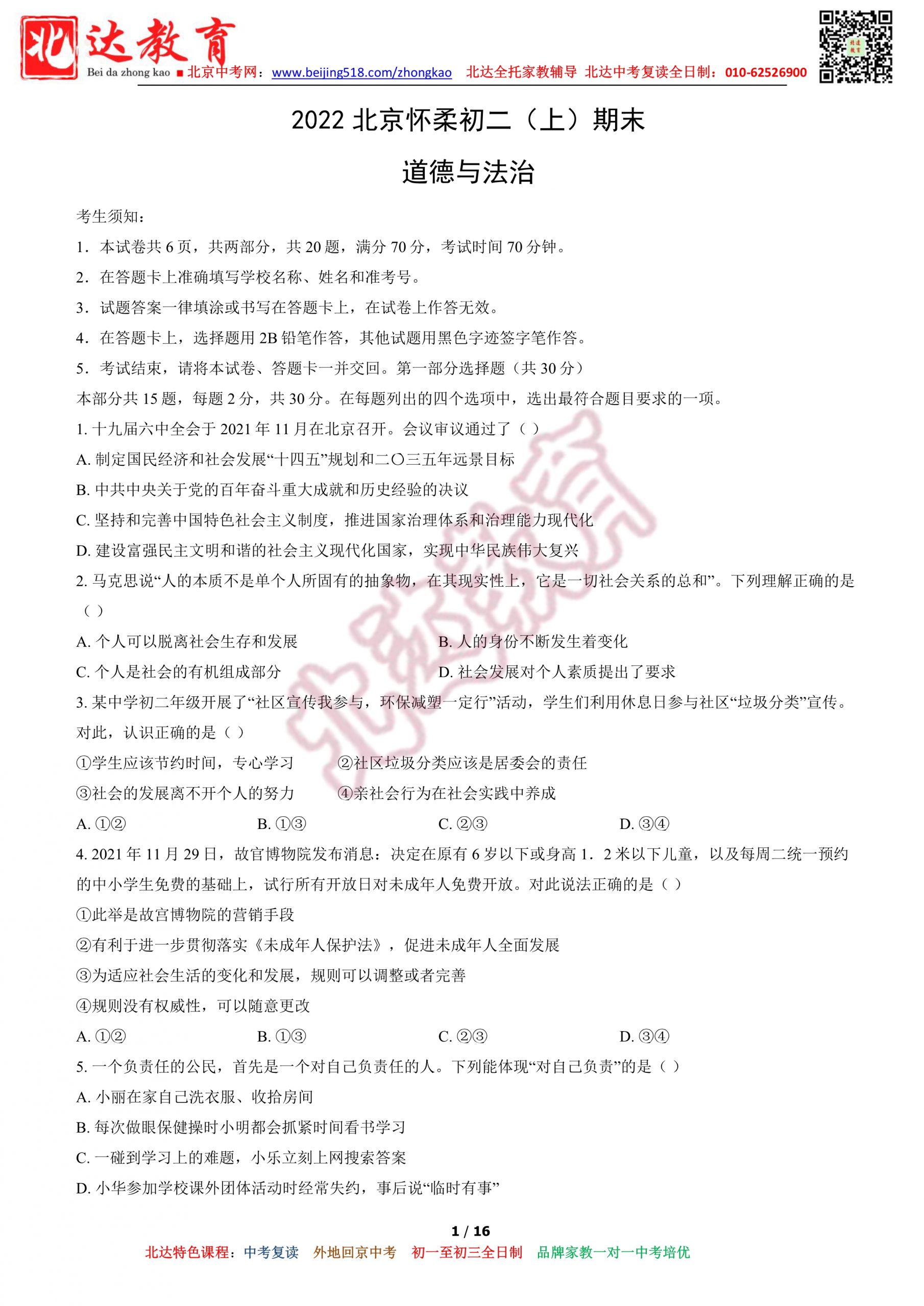 2022北京市怀柔区初二(上)期末道法试卷及答案!北京admw360教研组整理分享相关信息,供大家参考。