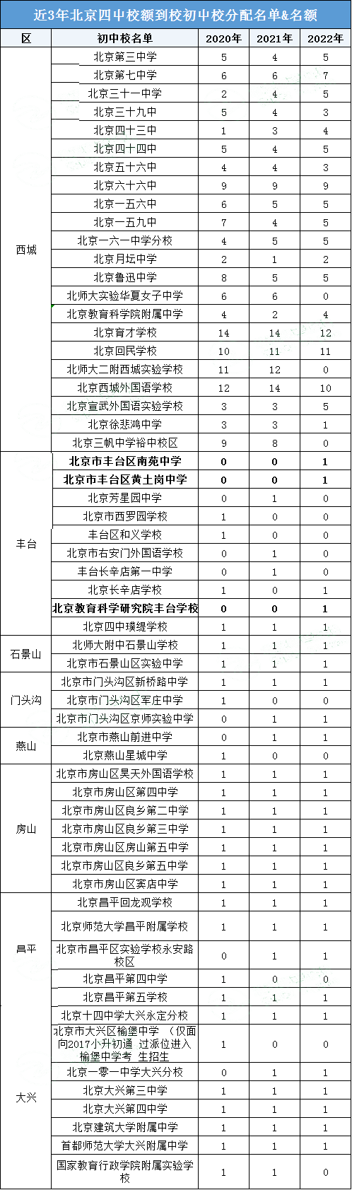 从近3年校额到校名额来看,北京四中对初中校的校额到校名额分配持续减少,需要注意的是2022年北京四中将校额到校名额又新分配了3所初中校,分别是北京市丰台区南苑中学、北京市丰台区黄土岗中学、北京教育科学研究院丰台学校。