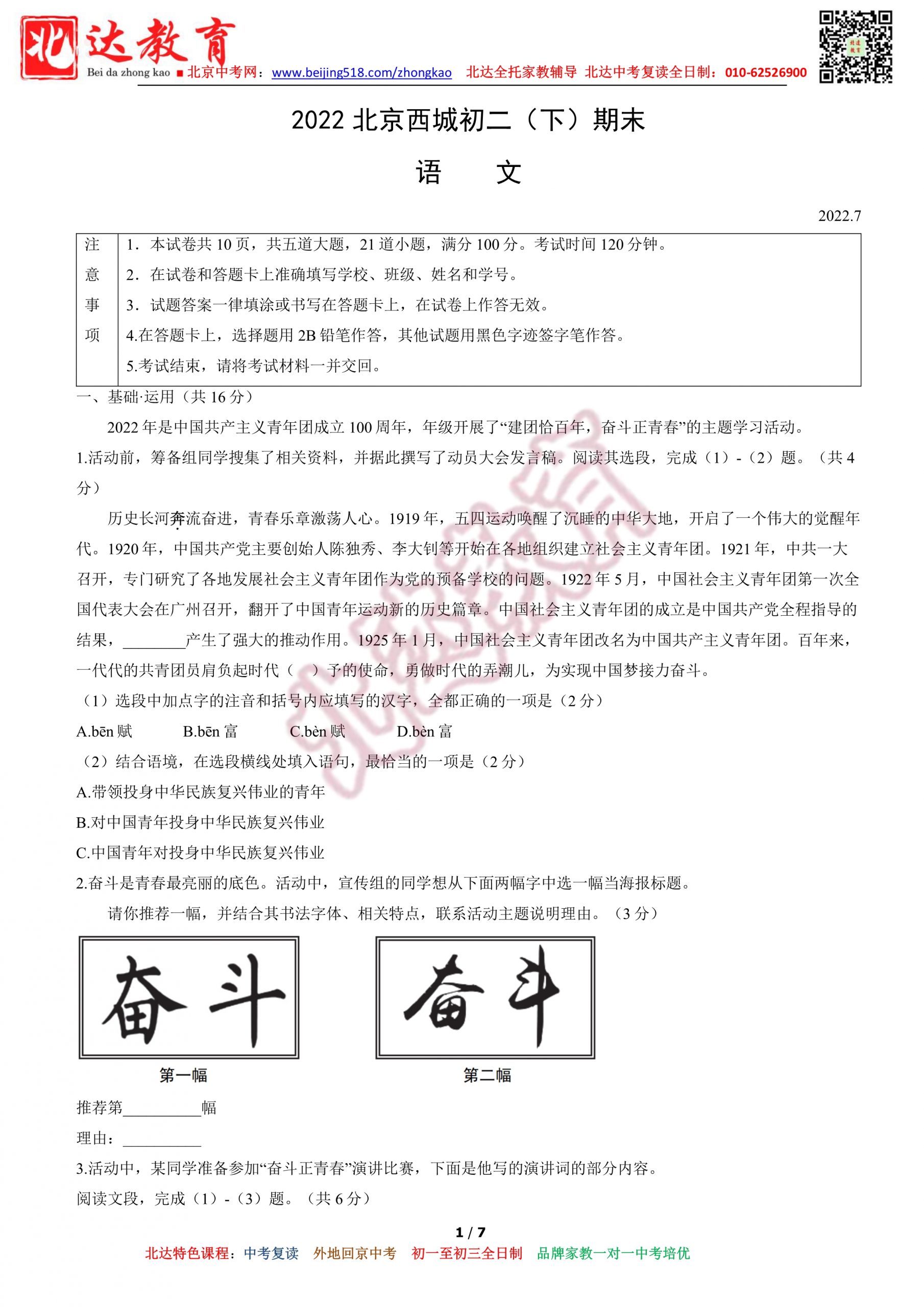 下载链接:2022北京市西城区初二(下)期末语文试卷(无答案)