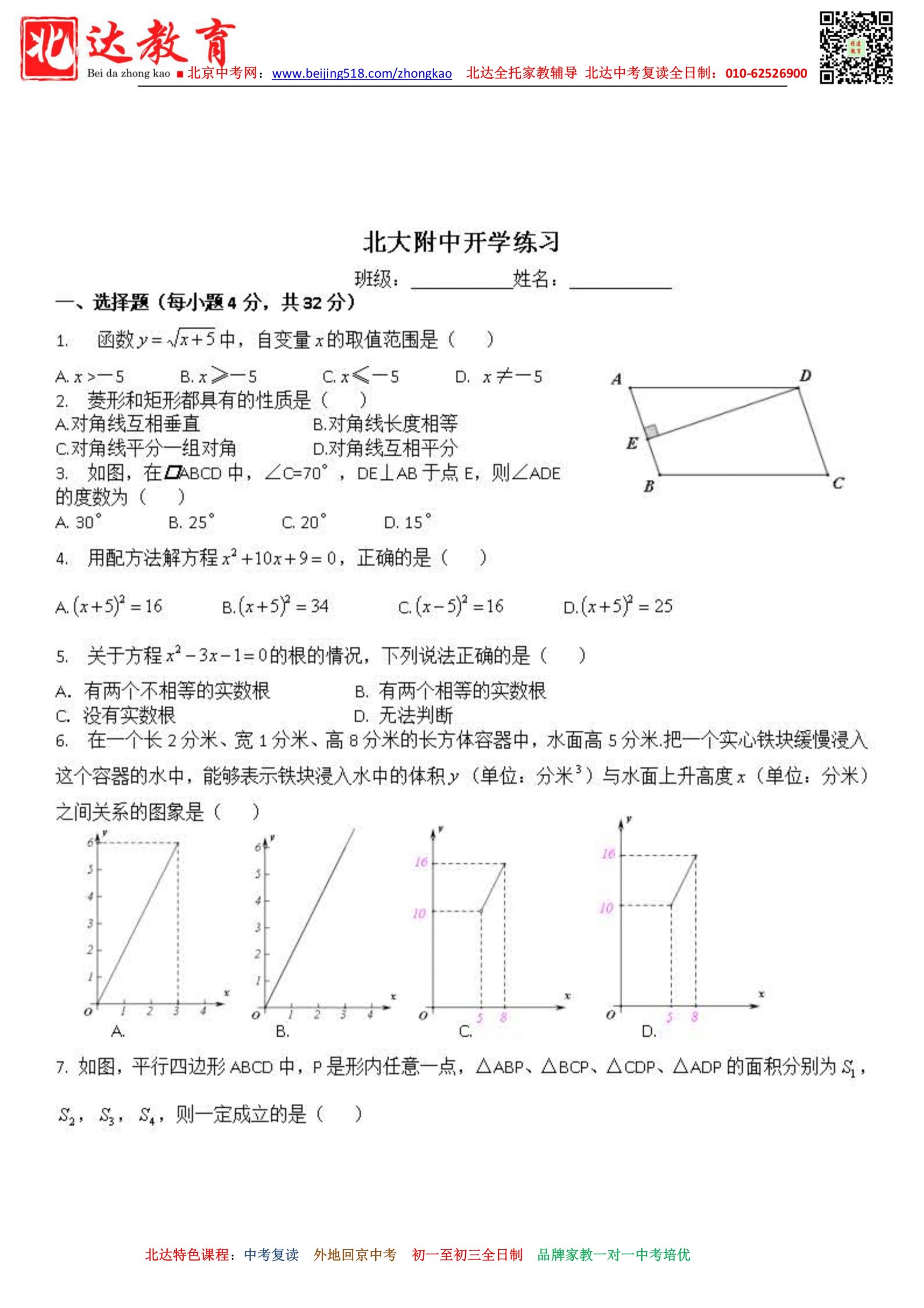 2022-2023学年北京市北京大学附属中学九年级(上)开学考数学试题!北京admw360教研组整理分享相关信息,供大家参考。