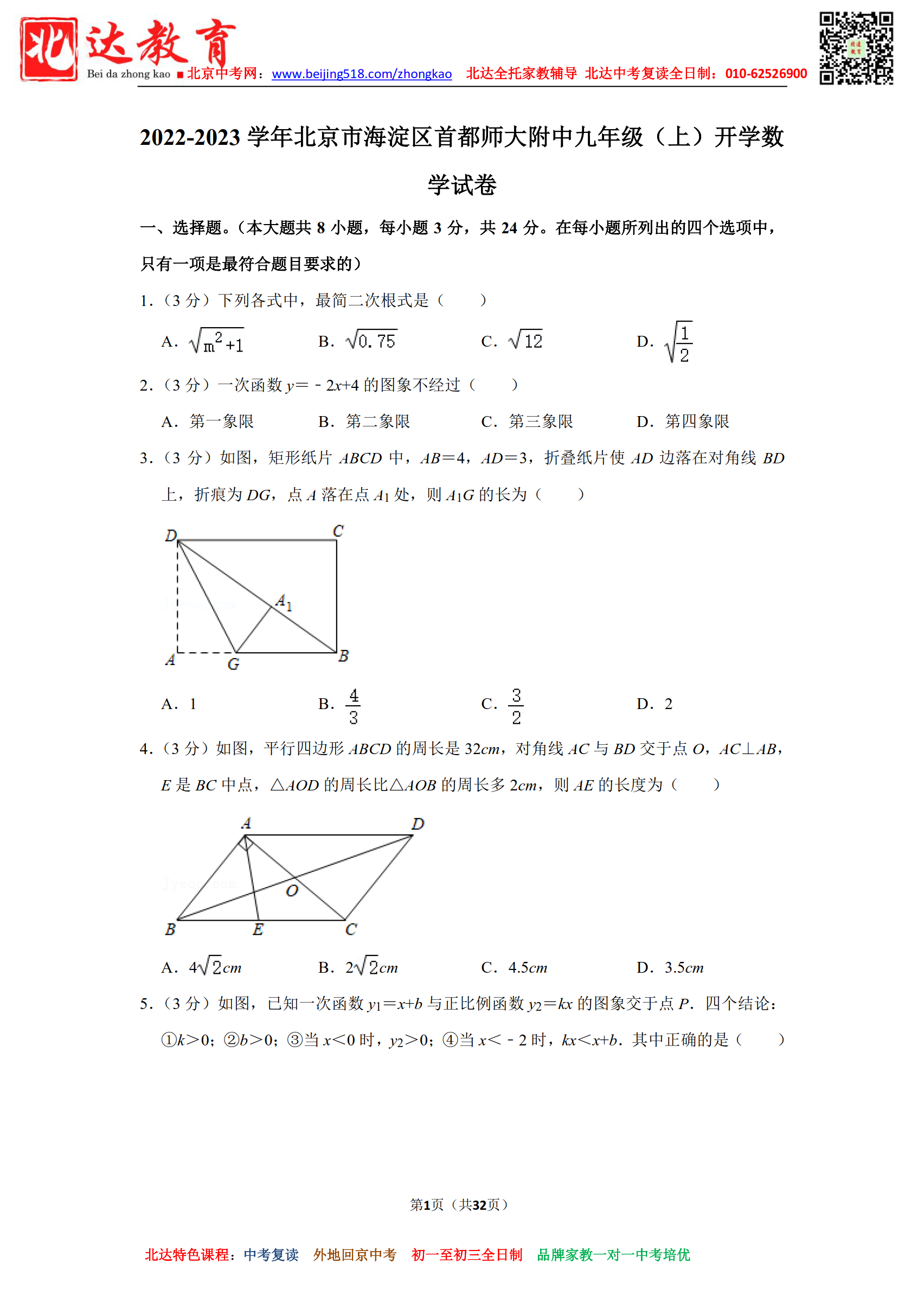 2022-2023学年北京市海淀区首都师大附中九年级(上)开学数学试卷.pdf